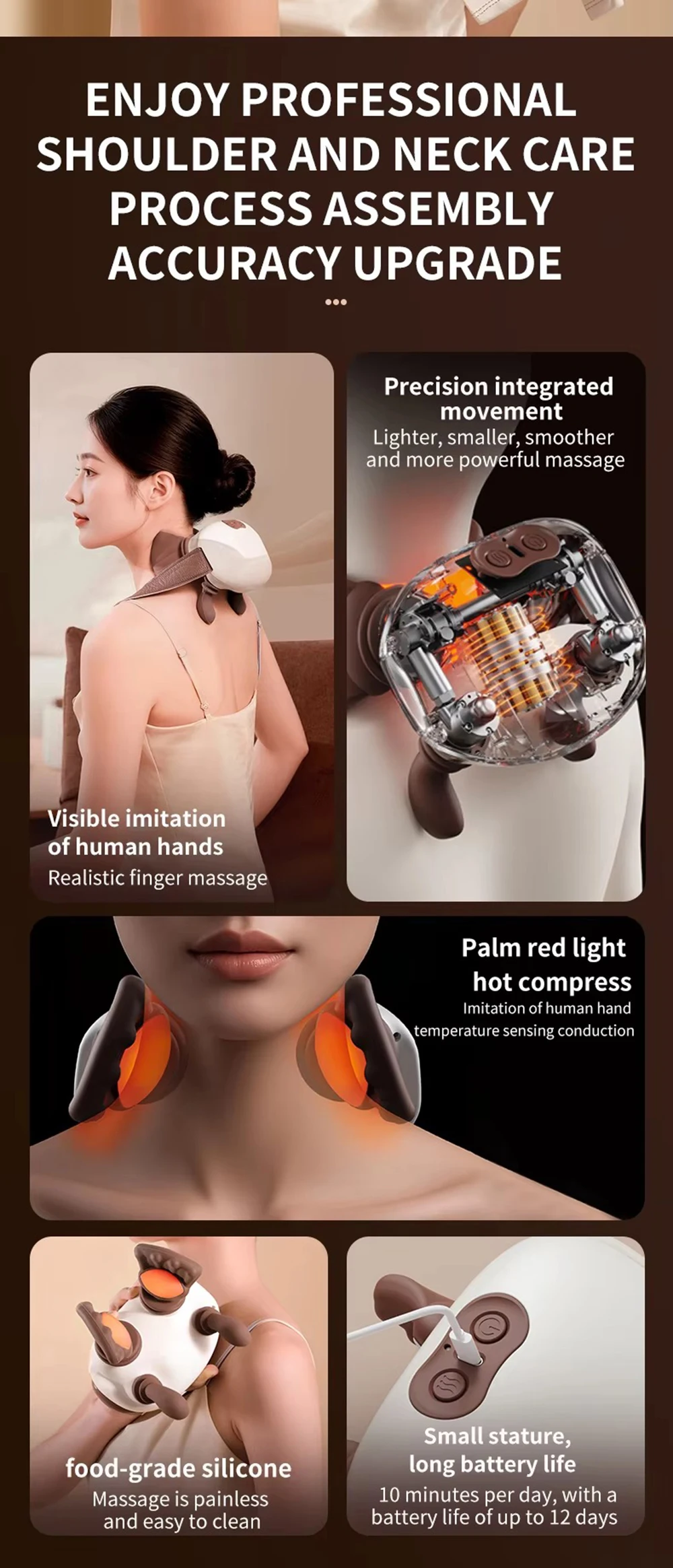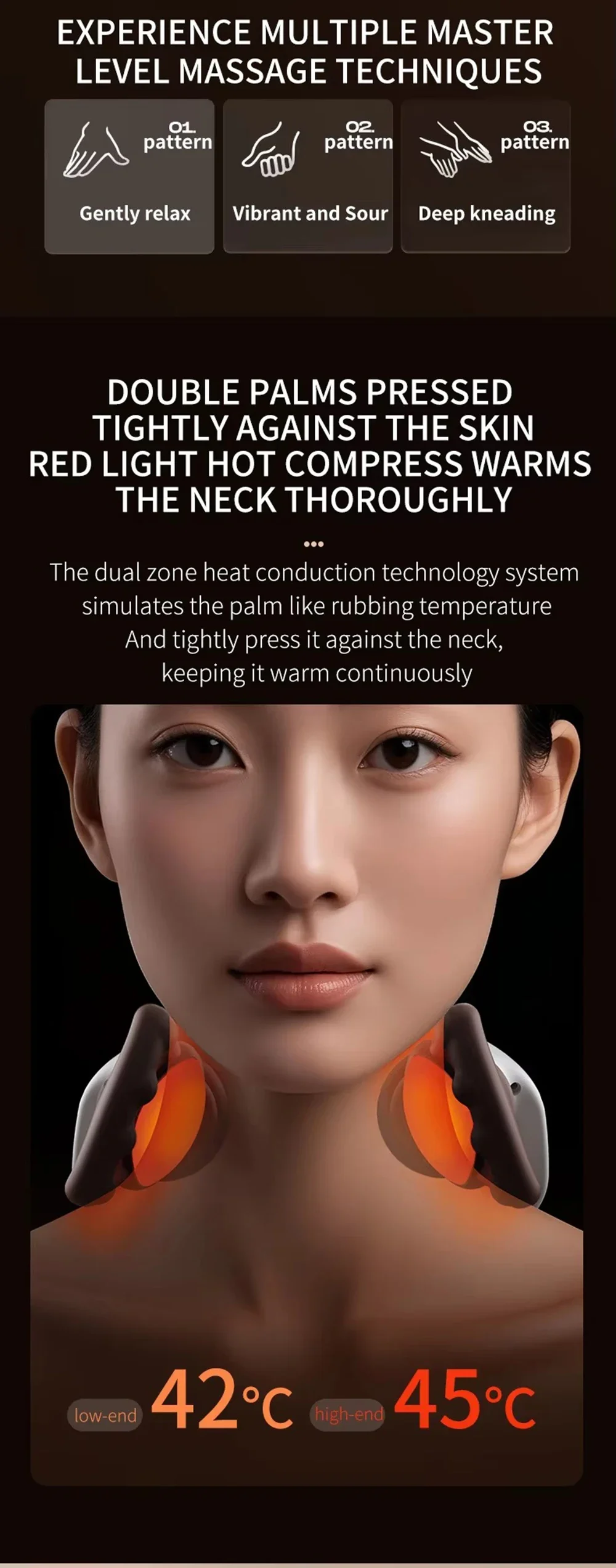 Sculpted to mirror the natural curve of your shoulder and neck. Palm-like grips and thumb-point nodes simulate pushing, rubbing, grasping, and pinching techniques for an authentic master-level massage experience.